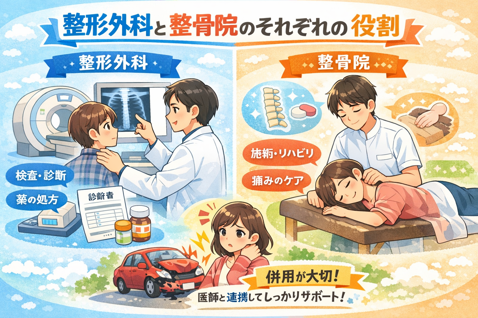 交通事故に遭ってしまったとき、「まず何をすればいいの?」「整骨院だけでいいの?」と不安になる方は少なくありません。実は交通事故の治療では、整形外科と整骨院それぞれに大切な役割があり、両方を正しく活用することがとても重要です。