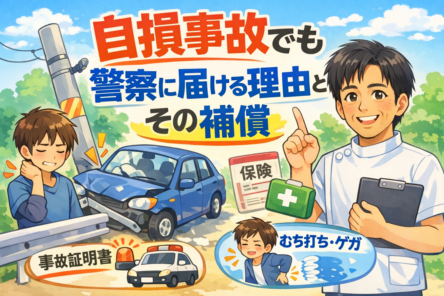 自損事故は、相手がいないからといって軽く考えてよいものではありません。警察への連絡は法的にも必要であり、交通事故証明書の取得、保険手続き、道路附属物の損傷対応、そして後から出る症状への備えという意味でも大切です。自損事故を起こしてしまったときは、まず安全確保を行い、警察へ連絡し、保険会社へ報告し、そのうえで体に違和感があれば早めに相談するようにしましょう。